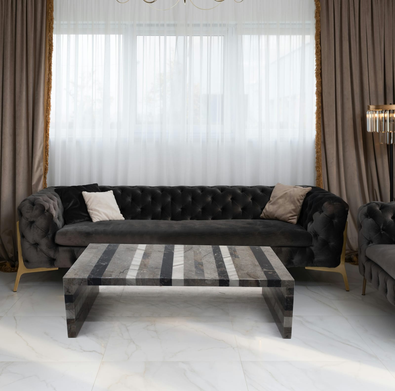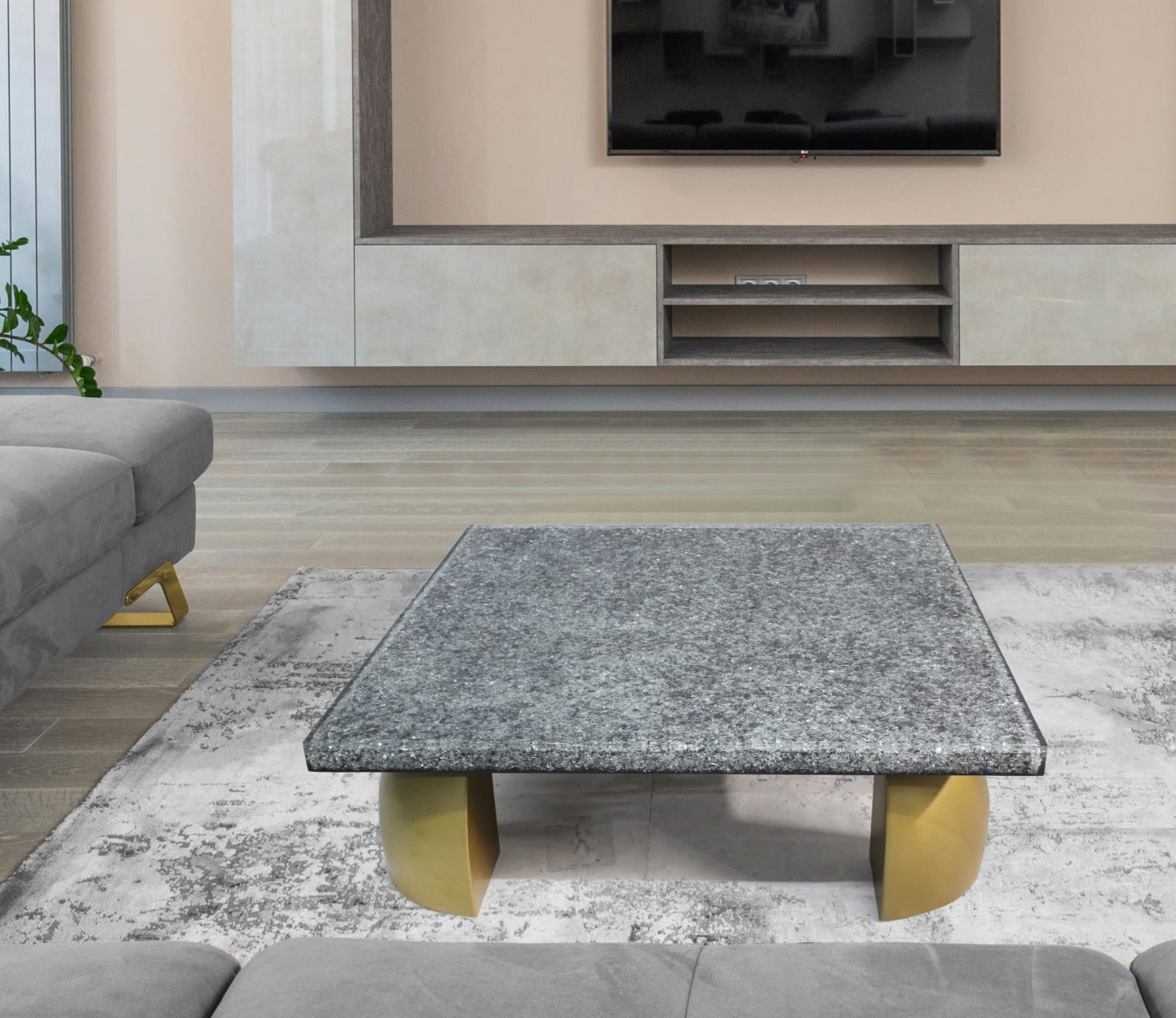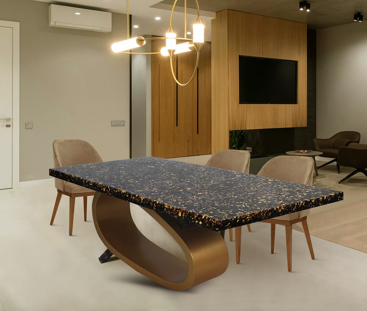 A golden river marble table enhanced with gold leaf and finished with an acrylic cast.