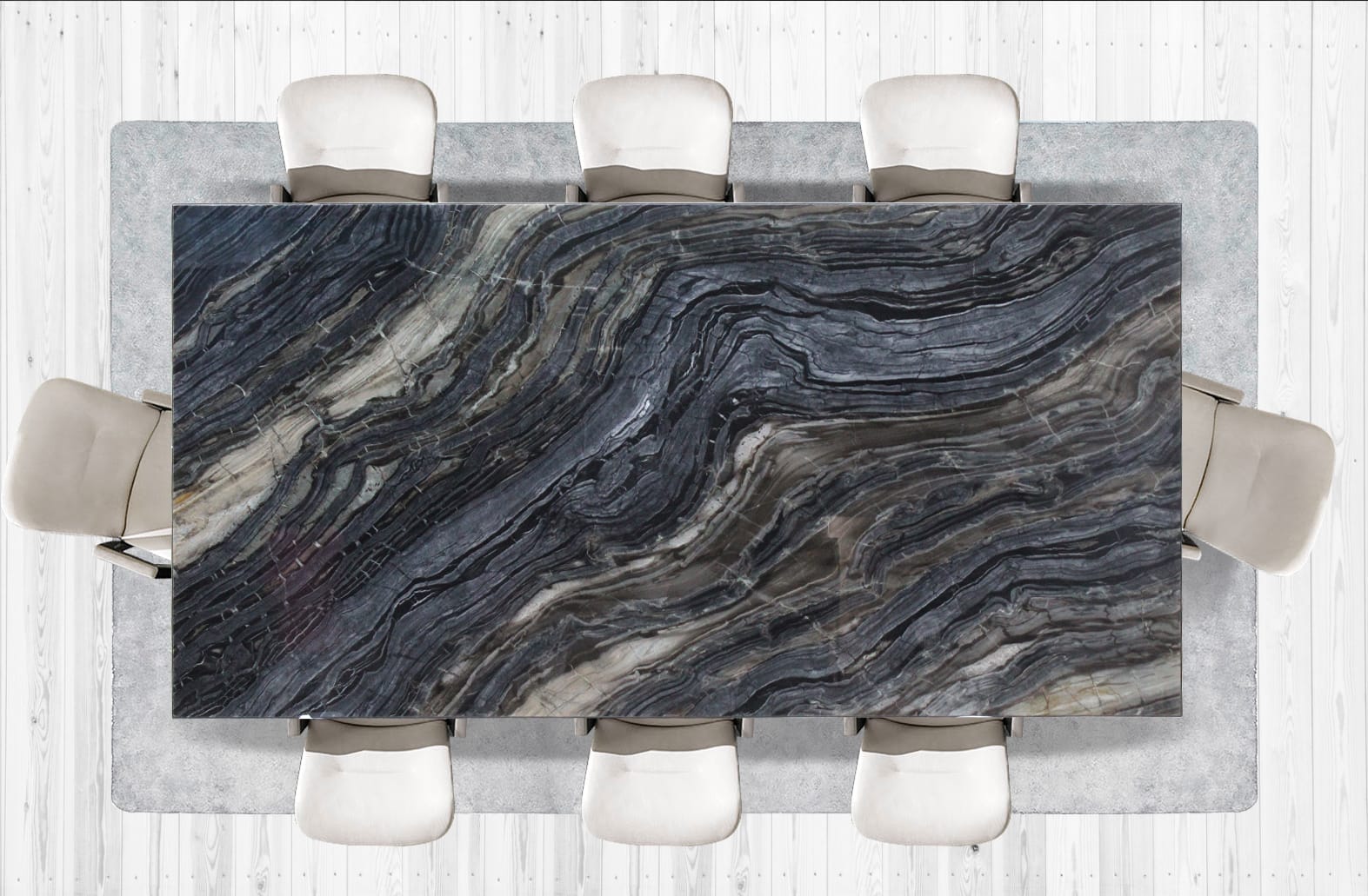 East Indian Walnut Wood Table casted in a Matt Finish with White Resin and a Crushed Stainless Steel Base.