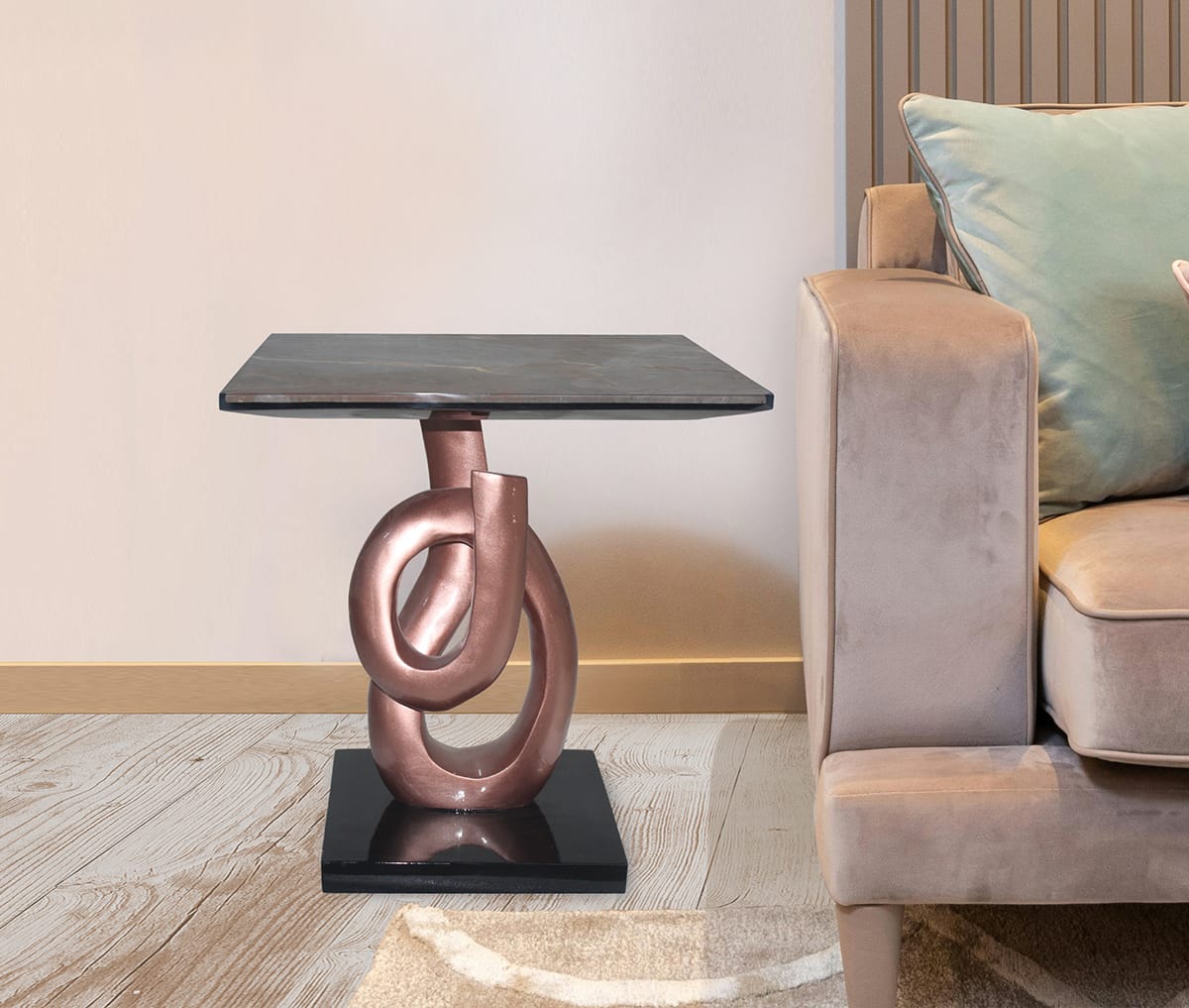 An Acrylic Casted wooden Table with Gold Leaf Inlay and a Metal Base. Comes with an Option of silver and rose gold.